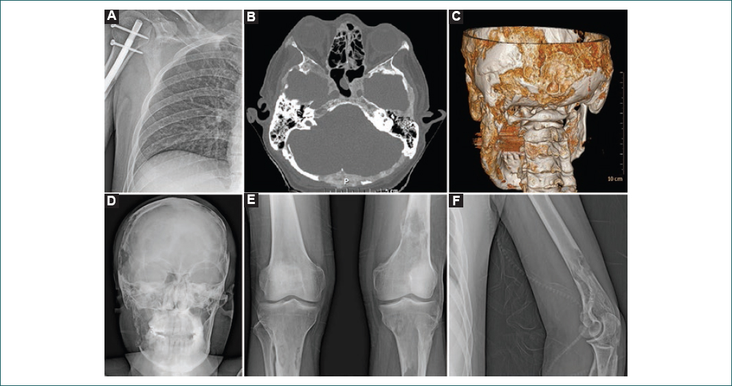 Durante el seguimiento por traumatología y ortopedia se observó la ausencia de consolidación, y además se encontró una protuberancia en la región occipital, fluctuante, no hipertérmica, con aumento progresivo de tamaño (Fig. 1 B y C). Se solicitó una serie ósea metastásica, que reportó lesiones líticas en el cráneo (Fig. 1 D), el tórax, ambos fémures y la tibia y el húmero izquierdos (Fig. 1 E y F), así como presencia de hipercalcemia grave (15.27 mg/dl). Al interrogatorio dirigido negó la presencia de fiebre, diaforesis, pérdida de peso o infecciones de repetición; refirió un adecuado apego al tratamiento antirretroviral, sin antecedente de infecciones oportunistas.
