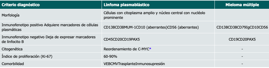 El linfoma plasmablástico (LPB) es un subtipo de linfoma no Hodgkin (LNH) de alto grado histológico, agresivo y poco frecuente, con características morfológicas e inmunofenotípicas que se superponen con las de otros subtipos de LNH1,2,3,4 y de neoplasias de células plasmáticas como el mieloma múltiple (MM), por lo que su diagnóstico puede ser complejo.1,2,3