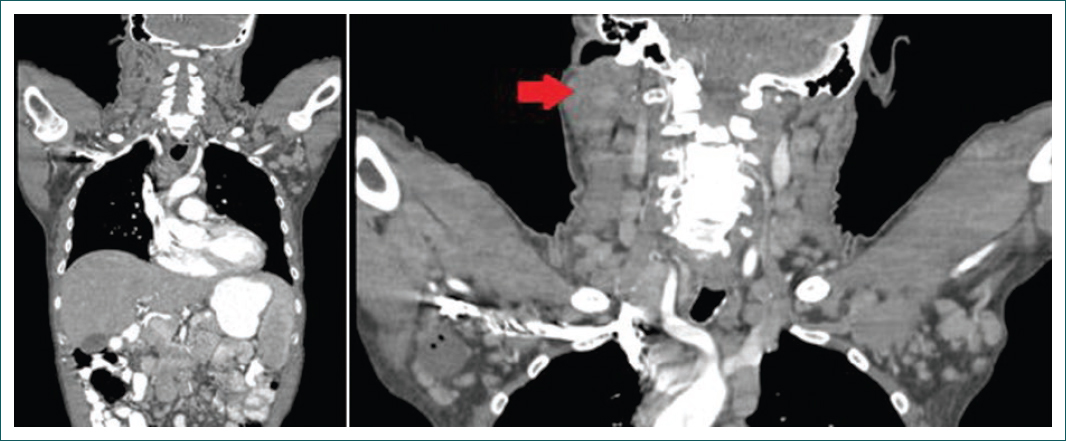 Varón de 68 años que inicia su padecimiento hace aproximadamente 2 años con adenopatías cervicales y axilares. Refiere astenia, adinamia, pérdida de peso, dolor oral y molestia abdominal. Ingresa a la clínica presentando palidez, adenomegalia submaxilar derecha de 5 × 3 cm, además de múltiples adenomegalias cervicales, supraclaviculares y axilares (Fig. 1).