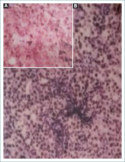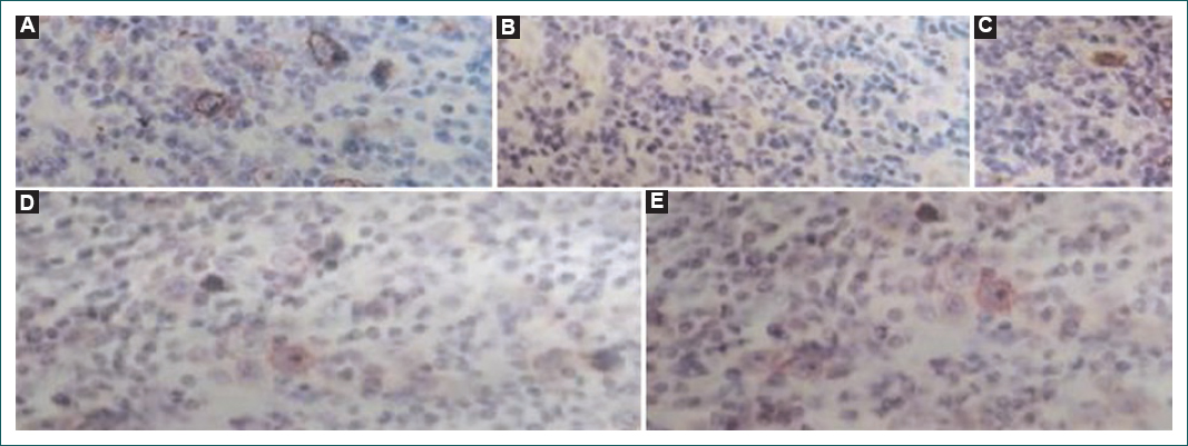 La biometría hemática reporta anemia (hemoglobina de 10.8 g/dl), leucocitopenia de 3.6 × 10^3 ml, plaquetas 107,000, deshidrogenasa láctica (LDH) 750 UI/l y albúmina 2.7 g/dl. Se realiza una tomografía computarizada que muestra adenomegalias cervicales, axilares y torácicas, derrame pleural izquierdo, hepatomegalia, lesión hipodensa en el segmento VI correspondiente a un hemangioma hepático, esplenomegalia y ganglios intraperitoneales y retroperitoneales inguinales aumentados de tamaño. Se realiza biopsia de una adenomegalia cervical que arroja el diagnóstico de LH clásico de tipo celularidad mixta, positivo para CD15, CD20, CD30, virus Epstein-Barr (VEB) y Antígeno Epitelial de Membrana (EMA), todos con al menos un 20% de positividad (Fig. 2). Se concluye LH de celularidad mixta en estadio clínico IIIb Hasenclever de 4 puntos. Se inicia quimioterapia citorreductora con esquema EVBD-R (epirubicina, vinblastina, bleomicina, dacarbazina-rituximab). Se realiza biopsia de médula ósea, la cual descarta infiltración por el linfoma.