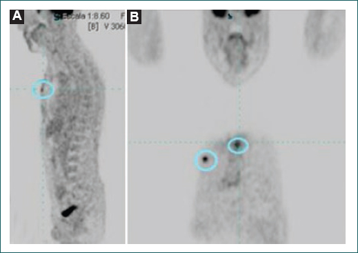 Tres días después del inicio de la quimioterapia se realiza una biometría hemática que muestra una disminución de la LDH a 228 UI/L y albúmina de 2.8 g/dl. Tres semanas después, la biometría hemática reporta hemoglobina de 11.3 g/dl, leucocitos 19.3 × 10^3 ml, plaquetas 432,000, LDH 238 UI/l, albúmina 3.9 g/dl y velocidad de sedimentación globular (VSG) de 32 mm/h. Terminados los seis ciclos de quimioterapia, la biometría hemática muestra hemoglobina de 10.9 g/dl, leucocitos 2.2 × 10^3 ml, plaquetas 288,000 y VSG de 15 mm/h. El paciente es sometido a una tomografía que muestra una adenomegalia submaxilar de 30 × 15 mm, alcanzando así una respuesta parcial. Seis meses después se realiza una tomografía por emisión de positrones, la cual reporta evidencia de actividad hipermetabólica tumoral en la región preesternal, anterior al músculo pectoral mayor derecho y la región inguinal derecha (Fig. 3).