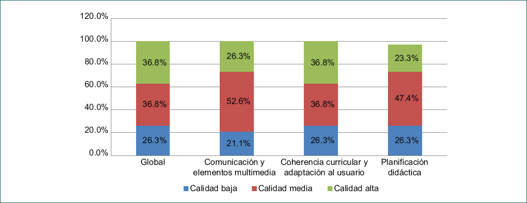 De acuerdo con el cuestionario MOOC, el 36.8% de los encuestados califica los cursos de manera global como de regular calidad, las dimensiones de comunicación y elementos multimedia y planificación didáctica con calidad media, y la de coherencia curricular y adaptación al usuario con calidad entre media y alta (Fig. 1).