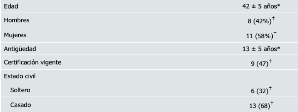 Se incluyeron 21 médicos (el 91.3% del total de médicos familiares adscritos a la unidad); dos participantes fueron excluidos por referir no haberse inscrito a ningún curso por falta de tiempo. El 58% fueron mujeres y el promedio de edad fue de 41 ± 5 años (moda de 40 años, intervalo de confianza del 95% para la media de 38.9-44.3). La antigüedad institucional fue de entre 5 y 24 años, con una media de 13 ± 5 años. El 53% no cuenta con certificación vigente por el Consejo Mexicano de Certificación en Medicina Familiar (CMCMF) (Cuadro I).