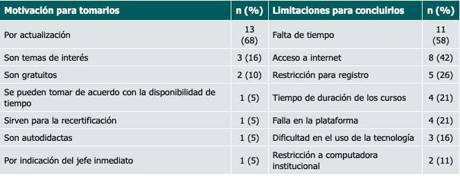 Resultados: El estudio incluyó a 19 médicos de los cuales el 58% fueron mujeres. La mayoría tomó los cursos en línea por actualización e interés profesional y personal, y señalan como principal limitación la falta de tiempo. También se mencionan restricciones en el registro, fallas en la plataforma, tiempo de duración del curso y desinterés. La calidad de los cursos fue calificada como regular por el 36.8% y baja por el 26.3%, siendo la adaptación al usuario y la planeación didáctica las puntuaciones más bajas.