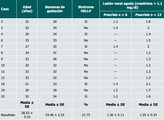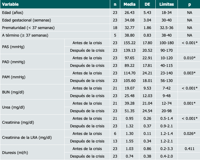 Resultados: La edad materna fue 26.43 ± 5.43 años y la gestación de 34.08 ± 3.04 semanas. Las crisis convulsivas se presentaron en el periodo preparto en el 69.56%, posparto en el 26.09% y en ambos en el 4.35%. La presión sanguínea anterior y posterior a las convulsiones mostró diferencias (sistólica 155.22 ± 17.80 frente a 139.13 ± 20.52 mmHg, p < 0.001; diastólica 97.65 ± 22.91 frente a 89.22 ± 17.81 mmHg, p = 0.010; media 114.70 ± 24.21 mmHg frente a 105.60 ± 18.01 mmHg, p = 0.003). La creatinina preconvulsiones fue de 0.95 ± 0.26 mg/dl y posconvulsiones de 1.32 ± 0.37 mg/dl (p < 0.001). La frecuencia de lesión renal aguda preconvulsiones fue del 26.08% (seis casos, creatinina 1.30 ± 0.11 mg/dl) y posconvulsiones del 56.52% (13 casos, creatinina 1.55 ± 0.34 mg/dl) (p = 0.026).