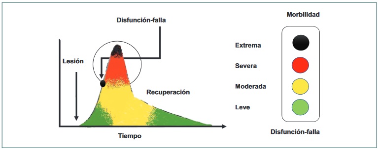 Semáforo de riesgo obstétrico; relación cromática entre disfunción-falla orgánica y grado de morbilidad.