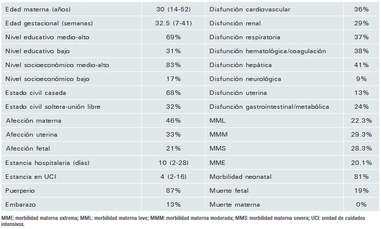 La población estudiada tiene una edad en etapa más fértil (30 años), pero el nivel socioeconómico y el estado civil no presentan el mismo reporte que en literatura convencional. En condición de ingreso, la afe-cción materna sigue marcando el elemento obstétrico que más activa el semáforo rojo. La tasa de recuperación se refleja directamente en la estancia hospitalaria; en comparación con las mujeres con embarazo y resolución normal, las pacientes que ingresan a la UCI por alguna complicación tienden a triplicar la estancia.1,2