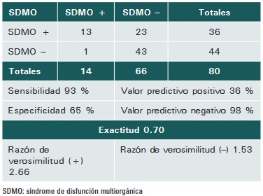 Las pruebas confirman de manera significativa que detectar el SDMO, como se propone, clasifica de manera objetiva a las pacientes con mayor morbimortalidad, y con ello es válido conjuntar las variables por grupos de disfunción y diferentes grados de morbilidad para encontrar el punto de inflexión donde se puede preveer su aparición.