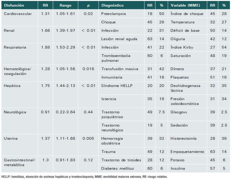 En el abordaje por grupo de disfunción, las observaciones realizadas muestran que los sistemas de la coagulación y hepático son los más afectados. Esto permite evidenciar la fisiopatología de las principales emergencias obstétricas (preeclampsia, sepsis y hemorragia obstétrica).15,18,19