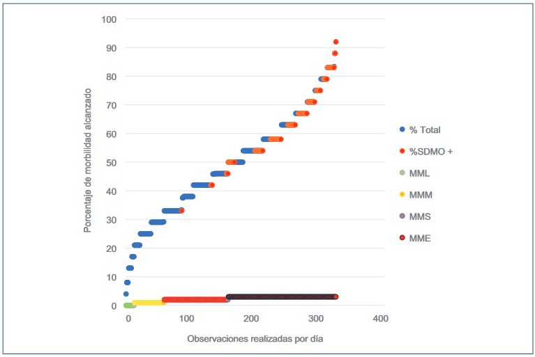 Se utilizóel puntaje o porcentaje alcanzado por cada paciente cada día de valoración. Entendiendo que las pacientes con SDMO tienen el acméde la enfermedad, para reforzar la hipótesis de la segunda fase, se utilizóinferencia estadística mediante el coeficiente de correlación de Pearson para asociar el porcentaje de morbilidad y la presencia de SDMO. Se elaboran tablas de contingencia por grupos de porcentaje para evaluar la asociación con el SDMO y se reportan como riesgo relativo (RR) y probabilidad (p). Se buscóel puntaje o porcentaje de mayor relevancia estadística que permita discriminar cada categoría.
