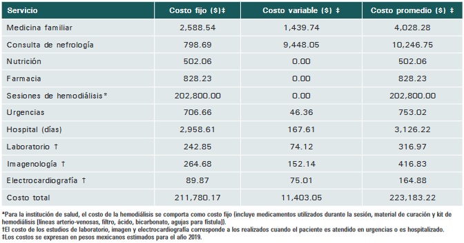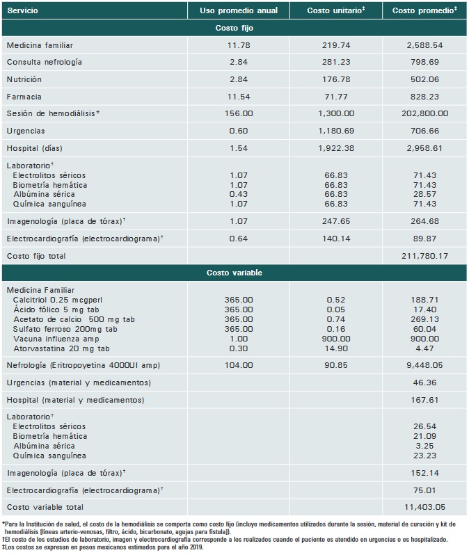El costo se estimó en pesos mexicanos para el año 2019. Se incluyeron el servicio de hemodiálisis (se adoptó el costo que la institución paga por el servicio subrogado) y todos los servicios institucionales empleados en 1 año para atender las condiciones de salud derivadas de la enfermedad renal crónica y del uso de hemodiálisis (consulta en medicina familiar incluyendo medicamentos, consulta en nefrología incluyendo medicamentos, consulta de nutrición, atención en farmacia sin incluir medicamentos, urgencias incluyendo medicamentos y material de curación, hospital incluyendo medicamentos y material de curación, laboratorio, imagenología y electrocardiografía). De estos servicios se calculó el costo promedio fijo anual por función de producción y servicio ajustado por perfil de uso, y el costo promedio variable anual por función de producción y servicio ajustado por perfil de uso; la suma de ellos identificó el costo promedio anual por función de producción y servicio.