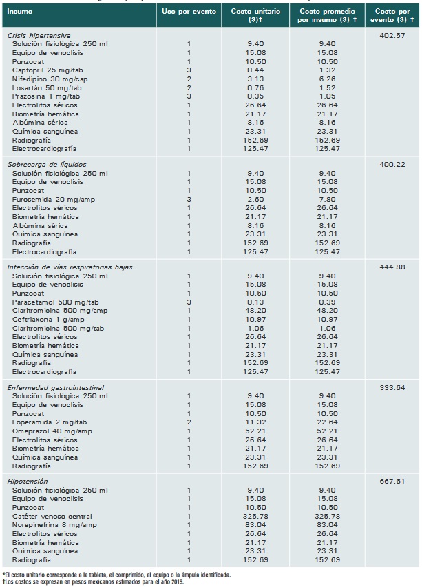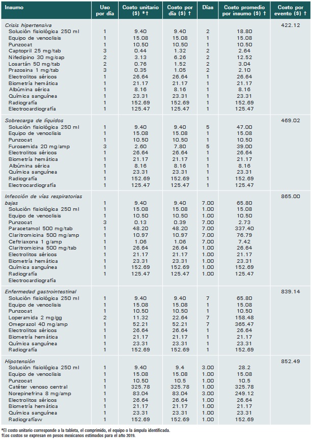En los pacientes en hemodiálisis que reciben atención en urgencias y en hospitalización por crisis hipertensiva, sobrecarga de líquidos, infección de vías respiratorias bajas, enfermedad gastrointestinal e hipotensión, el costo variable por evento fluctúa entre $333.64 y $667.61 en urgencias (Cuadro III) y entre $422.12 y $865.00 en el hospital (Cuadro IV).