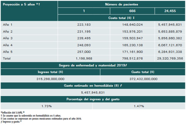 Resultados: El costo promedio anual del paciente con enfermedad renal crónica manejado con hemodiálisis varía entre $223,183 y $257,000; el costo en la vida es de $1,198,968. El costo total para la institución supone entre el 1.47% y el 1.73% del presupuesto.
