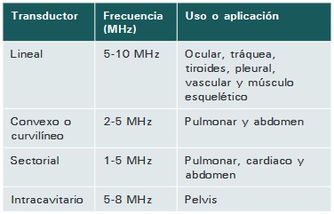 El ultrasonido se caracteriza por la emisión de ondas sonoras con frecuencias mayores que las que el humano puede escuchar, es decir, mayores de 20,000 Hz. A mayor frecuencia, menor penetración o profundidad de las estructuras internas, con mayor calidad de imagen; en cambio, a menor frecuencia, mayor penetración o profundidad para el estudio de estructuras internas, pero con menor calidad de imagen. Esto radica en la elección del transductor, elemento que emite las ondas sonoras y a la vez es receptor de estas para la reproducción de las imágenes (Cuadro II). Así, en el ultrasonido pulmonar, para visualizar detalladamente la pleura se requiere un transductor de alta frecuencia, mientras que para valorar el tejido pulmonar y la cavidad pleural lo indicado es un transductor de baja frecuencia.31,32,33