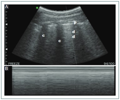 Imagen normal. A: modo bidimensional. B: modo M: «signo de la playa». c: sombra costal; d: líneas A; p: línea pleural.