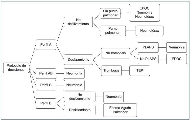 El protocolo BLUE inicia con la búsqueda de artefactos, que originan signos y consecuentemente el conjunto de estos aporta unos perfiles que guían la toma de decisiones. Se cuenta principalmente con un perfil A y un perfil B, pero pueden ser combinados, cuando un pulmón muestra predominio A y el otro B, lo que se denomina perfil A/B. Si en la búsqueda se observa una línea C, puede atribuirse que el perfil C se encuentra presente. En la evaluación de estos perfiles estamos obligados a realizar la búsqueda de los PLAPS, siendo de suma importancia reportar si hay PLAPS positivos, es decir, si observamos un signo de consolidación alveolar o derrame pleural, y siendo PLAPS negativo, la ausencia de estos. En los perfiles A y B, nuestro algoritmo nos muestra que se debe buscar deslizamiento pulmonar y punto pulmonar, y realizar la determinación del dímero D, una ecografía cardiaca y un ultrasonido Doppler de miembros inferiores.39,40,41,42,43,44,45