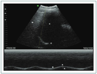 Valoración diafragmática. A-A: movimiento diafragmático; A-B: tiempo inspiratorio máximo diafragmático; C: parénquima hepático; D: parénquima pulmonar; E: diafragma.