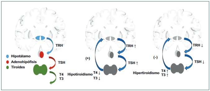La tiroides es una glándula que se encarga de conservar la homeostasis de la energía corporal y de regular su consumo a través de la estimulación del metabolismo celular. Para cumplir con tal función produce, a partir del yodo, dos hormonas peptídicas que son la triyodotironina (T3) y la tetrayodotironina (T4), a merced de la estimulación por otra hormona generada en la adenohipófisis, denominada hormona estimuladora de la tiroides (TSH, thyroid stimulating hormone), con lo que integra el eje hipotálamo-hipófisis-tiroides (Fig. 1).1