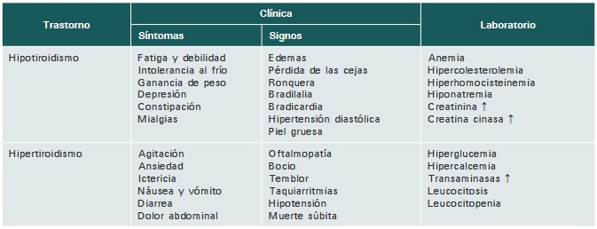 En concordancia con una situación de exceso o defecto de T3 y T4 figuran, respectivamente, los trastornos conocidos como hipertiroidismo e hipotiroidismo, con una prevalencia variable según las distintas localizaciones geográficas y con un amplio espectro de manifestaciones clínicas que pueden acarrear gravedad.