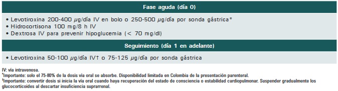 En la gran mayoría de los escenarios descritos en los párrafos anteriores, la decisión de iniciar o no tratamiento permite esperar los resultados de las pruebas de laboratorio. Empero, cuando se trata de situaciones que ponen en peligro la vida, como es el caso del coma mixedematoso y la tormenta tiroidea, es imperativo el inicio de la terapia farmacológica de manera precoz, antes de obtener los resultados del perfil tiroideo.14