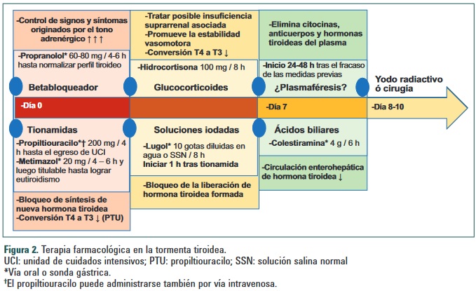 Una vez tomada la decisión de iniciar la terapia farmacológica, se sugiere proceder tal como se muestra en la figura 2. En los pacientes que no cumplan con todos los criterios establecidos para el diagnóstico, algunos autores prefieren iniciar inmediatamente el uso de un betabloqueador a una dosis que permita lograr el control de la frecuencia cardiaca, seguido de una dosis de un antitiroideo, entre los que se prefiere el propiltiouracilo sobre el metimazol por su efecto sobre la disminución de la conversión de T4 a T3.3,9 Ambos fármacos se han relacionado con la aparición de hepatotoxicidad, por lo cual se sugiere monitorizar la función hepática de estos pacientes previamente a su administración.21