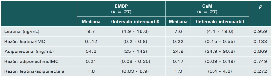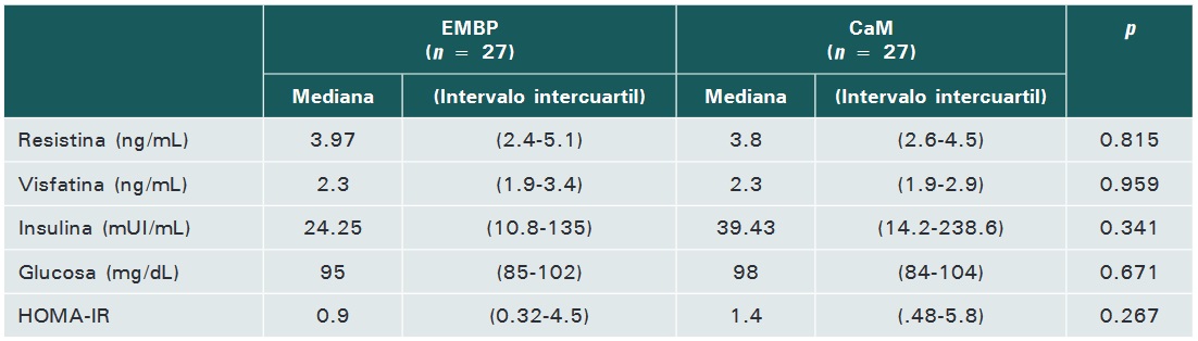 Los niveles séricos de adipocitocinas (leptina, adiponectina, resistina y visfatina), glucosa e índice HOMA-IR no mostraron diferencias significativas entre los grupos, sin embargo, a pesar de no haber alcanzado significancia estadística, la insulina mostró un comportamiento clínico diferente entre los grupos (CaM = 35.41 mU/mL frente a EMBP = 13.18 mU/mL; . = 0.069) (Cuadros III-IV).