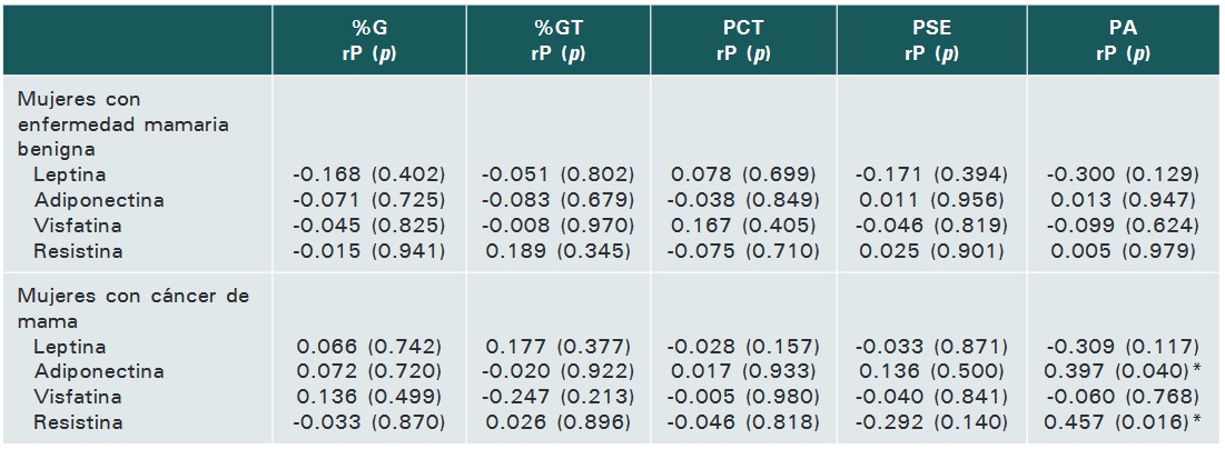 La correlación entre los valores de adipocitocinas y otros indicadores metabólicos y antropométricos mostró una asociación significativa entre los niveles de visfatina y la medida del diámetro humeral (rP = -0.295; . = 0.031) y de los niveles de leptina con el pliegue abdominal (rP = 0.286; . = 0.036) en la todas las mujeres estudiadas (Cuadro V). En el grupo de pacientes con CaM se observó una correlación significativa entre la adiponectina (rP = 0.397; . = 0.04) y la resistina (rP = 0.457; . = 0.016) con el pliegue abdominal, y una correlación de 0.555 (. = 0.004) entre el porcentaje de expresión de RE, RP, y Her2-Neu con los niveles de adiponectina (rP = 0.701; . = 0.000). Se identificó un patrón similar entre la expresión de RP y el HOMA-IR (rP = 0.400; . = 0.047), con una tendencia a la asociación entre la expresión de receptores hormonales y las alteraciones de metabólicas en las mujeres con CaM.