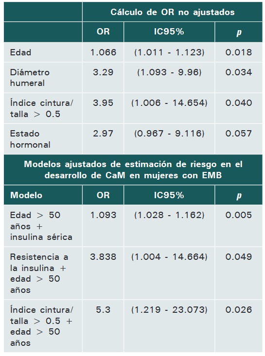 Con base en estos hallazgos se calcularon Odds Ratio para estimar el riesgo de desarrollo de CaM en mujeres con EMBP; se identificaron tanto la edad y el diámetro humeral como estimadores del riesgo de desarrollo de CaM en las mujeres con EMBP (cuadro VI).