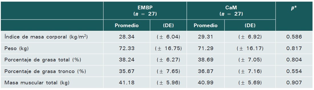 En el grupo de pacientes con CaM, el estado hormonal predominante fue la posmenopausia (70.37%), comparado con el 44.5% en mujeres con EMBP (. = 0.049); pese a estas diferencias entre grupos, en cuanto a la edad y el estado hormonal, el porcentaje de sobrepeso-obesidad en ambos grupos de pacientes fue superior al 70%. Las mujeres con obesidad alcanzaron el 48.1% de las mujeres con CaM y el 25.9% de aquellas con EMBP, el somatotipo predominante en ambos grupos fue el endomesomórfico (EMBP: 85.2% frente a CaM: 74.1%, . = 0.419).