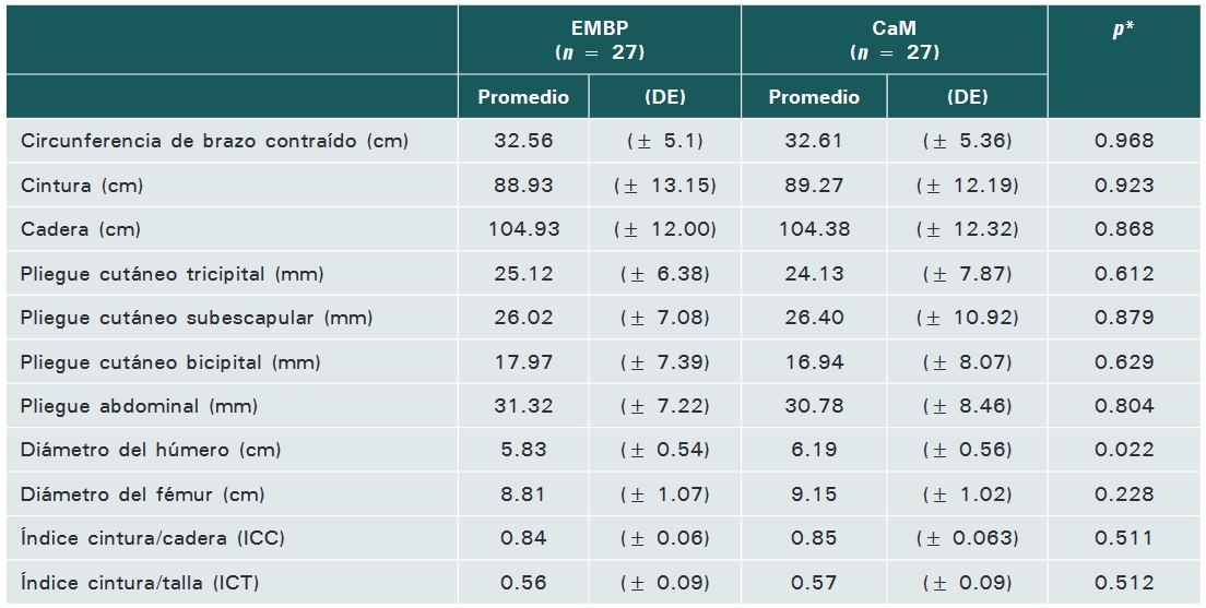 No se observaron diferencias entre grupos en el estudio de composición corporal por bioimpedancia (Cuadro I) o por antropometría (Cuadro II). El diámetro humeral es significativamente mayor en el grupo de pacientes con CaM respecto al grupo EMBP [6.19 (± 0.56) centímetros frente a 5.83 (± 0.54) centímetros; . = 0.022]. No hubo diferencia significativa (. = 0.512) en el ICT de las mujeres con EMBP [0.56 (± 0.09)] comparado con las mujeres con CaM [0.57 (± 0.09)] (. = 0.512). El ICT ³ 0.5 estuvo presente en el 59% de las mujeres con EMBP frente al 85% de las mujeres con CaM.