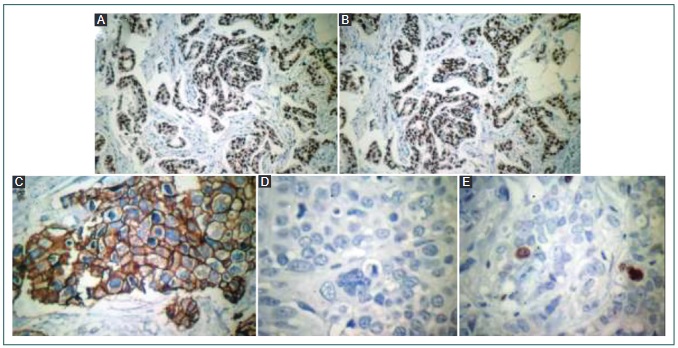 Se muestran microfotografías de tejido de cáncer de mama representativas para la expresión. A: receptores de estrógenos positivos. B: receptores de progesterona positivos. C: HER2 positivos. D: triple negativo. E: marcador Ki67.