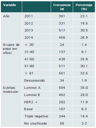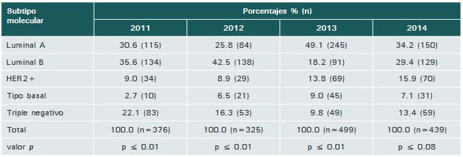 Debido a su valor pronóstico, actualmente el principal objetivo del estudio fue evaluar la distribución de los subtipos moleculares de cáncer de mama a lo largo de los años 2011 al 2014.