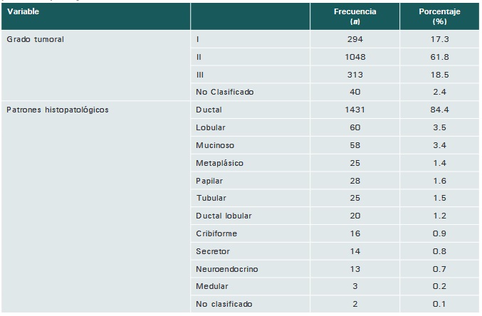 Por otro lado, la mayoría de los casos se reportaron como grado histológico II (1048; 61.8%), seguidos por los del grado III (313; 18.5%) y los de grado I (18.5%); asimismo, hubieron algunos casos que no pudieron ser determinados (2.4%).