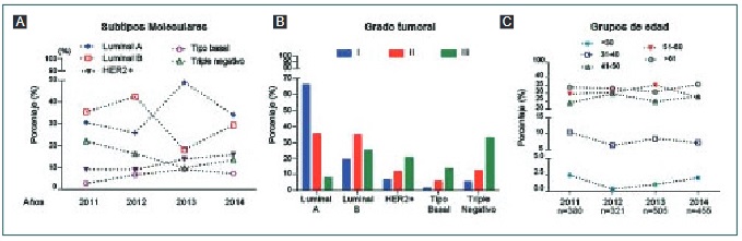 Un resultado preocupante fue la ligera tendencia en el aumento de las frecuencias de los subtipos moleculares más agresivos de cáncer de mama en los dos últimos años evaluados en este estudio, como HER2+ (9.0%, 2011; 8.9%, 2012; 13.8%, 2013, y 15.9%, 2014) y los basales (2.7%, 2011; 6.5%, 2012; 9.0%, 2013, y 7.1%, 2014) (Fig. 2A) (Cuadro III).