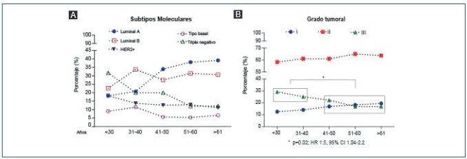 Al comparar los subtipos moleculares de cáncer de mama, con los diferentes grupos de edad, nuestro análisis muestra que las mujeres mexicanas con cáncer de mama menores de 40 años, presentan un riesgo mayor de tener un subtipo tumoral triple negativo, basal y HER2+, mientras que los tumores luminal A se encuentran con mayor frecuencia en pacientes mayores de 40 años. Por otro lado, en nuestro estudio se muestra que el riesgo de presentar tumores con un grado histopatológico III aumenta en pacientes menores de 40 años, las cuales tienden a presentar subtipos moleculares de cáncer de mama más agresivos.