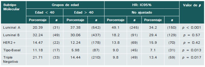 Distribución de los subtipos moleculares en pacientes con cáncer de mama mayores y menores de 40 años
