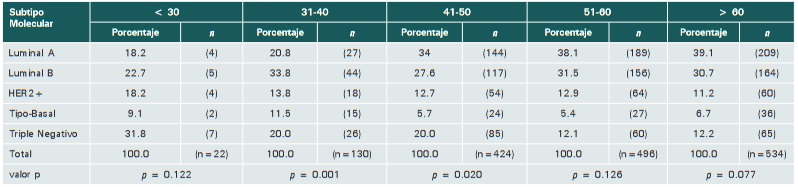 De los 1639 casos clasificados como luminal A, luminal B, HER2+, basal y triple negativo, solo 1606 de los casos (95%) se correlacionaron con los diferentes grupos de edad.
