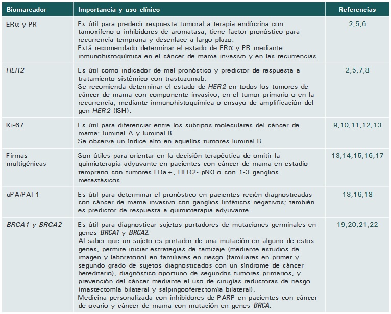 Los biomarcadores para cáncer de mama citados en esta revisión son algunos de los que actualmente tienen aplicación clínica, dentro de la gama de moléculas que se encuentran en fase de estudio y validación. La mayoría se utilizan de forma rutinaria en otros países, particularmente, las firmas multigénicas, al encontrarse ya normado su uso en diversas guías y prácticas clínicas al haberse probado su utilidad mediante ensayos clínicos aleatorizados.