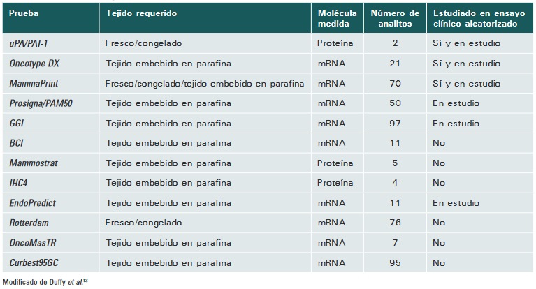 Aunque en un principio estas firmas génicas fueron implementadas para determinar el pronóstico, recientemente se han llevado a cabo estudios que muestran su utilidad para ayudar en la toma de decisiones con respecto a la administración de quimioterapia adyuvante en mujeres recientemente diagnosticadas con cáncer de mama.13 En el Consenso de St. Gallen de 2017 se llegó a la conclusión de que todas las pruebas multigénicas ayudan a decidir si se puede omitir la quimioterapia en pacientes con tumores ER+, HER2- pN0 (sin afectación a ganglios linfáticos) en estadio temprano.14 La Sociedad Americana de Oncología Clínica (ASCO, por sus siglas en inglés) recomienda el uso de Oncotype DX, EndoPredict, MammaPrint, PAM50 y Breast Cancer Index en pacientes ER/PR+, HER2- sin afectación a ganglios linfáticos para dirigir las decisiones en cuanto al uso de quimioterapia sistémica.16 A la fecha, solo uPA/PAI-1, Oncotype DX y MammaPrint han sido estudiados en cuanto a su valor clínico como parte de ensayos clínicos aleatorizados. Prosigna, EndoPredict y Genomic Grade Index son estudiados en ensayos clínicos en curso.13 Sin embargo, hasta el momento ninguna firma génica está recomendada para usarse como biomarcador con valor predictivo para respuesta a cierto tratamiento específico con quimioterapia.13