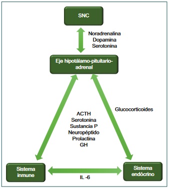 Interacción de los sistemas nervioso central, inmunológico y endócrino en el desarrollo de la depresión.