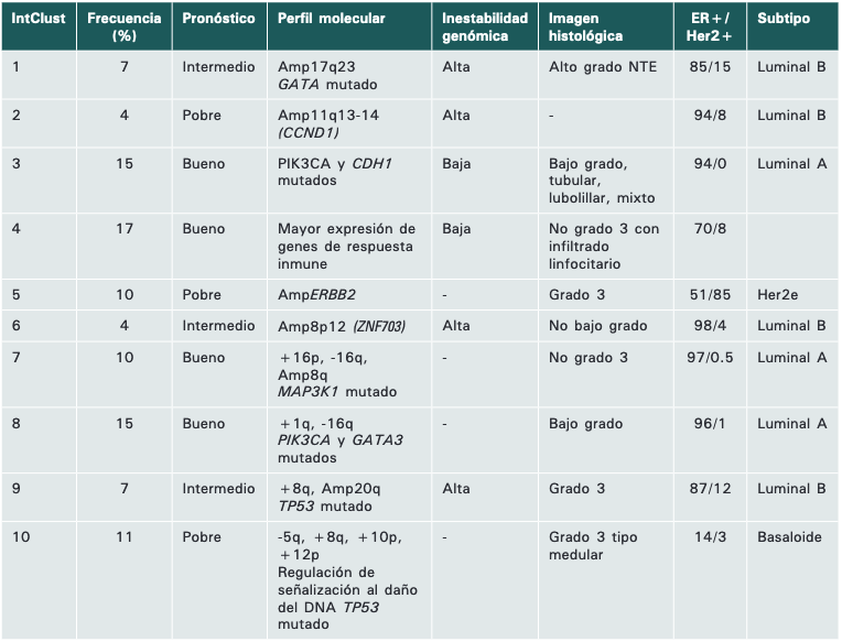Descripción de los 10 nuevos grupos integrados de los subtipos de cáncer de mama de acuerdo con el Consorcio Internacional de la Taxonomía 2018