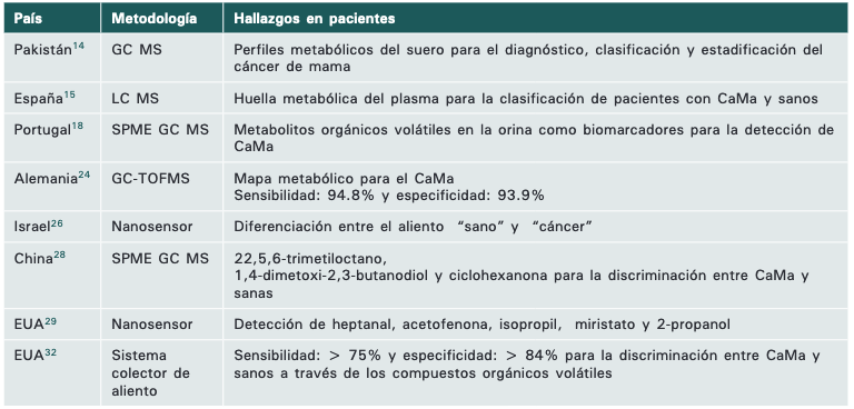 Desde hace varios años, un sinnúmero de reportes están mostrando que el CaMa, al igual que cualquier otro tipo de cáncer, presenta COV (Cuadro II) y que estos pueden ser detectados mediante la exhalación o aliento de las pacientes.28,29 Sin embargo, la información de los COV asociados al CaMa aún permanece en secreto de propiedad (patentes en proceso) para su uso en la miniaturización de sistemas y puestas de nanopruebas para utilidad comercial. En su mayoría, los reportes muestran una gran variabilidad de datos, lo cual puede ser el resultado de cómo fue tomada la muestra, que en muchas ocasiones no se menciona pero que comúnmente se realiza mediante una prueba no invasiva, conocida como la exhalación (exhalómica). Los resultados sugieren que la detección de trazas de COV no específicos del tejido de mama provienen de los pulmones resultando de la combinación de gases.