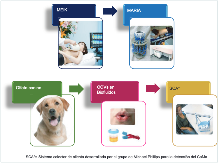 Datos históricos indican que los antiguos egipcios y los alquimistas ya los utilizaban para diagnosticar enfermedades. En los últimos años del siglo pasado se retomó la detección de COV asociados a distintas enfermedades, entre ellas el cáncer, particularmente el CaMa, y se comenzó con el uso perros que fueron conocidos como perros detectores. Estos animales tienen la capacidad de oler los COV del cáncer (por ejemplo: del cáncer de pulmón, mama, colon y recto, próstata, cervicouterino y ovario) en muestras de orina, sangre, aliento y tejido.22,23 A pesar de lo sorprendente que esto pueda resultar, hay que destacar que, al igual que en el cáncer, los perros pueden detectar armas, narcóticos y humanos en siniestros con gran precisión.