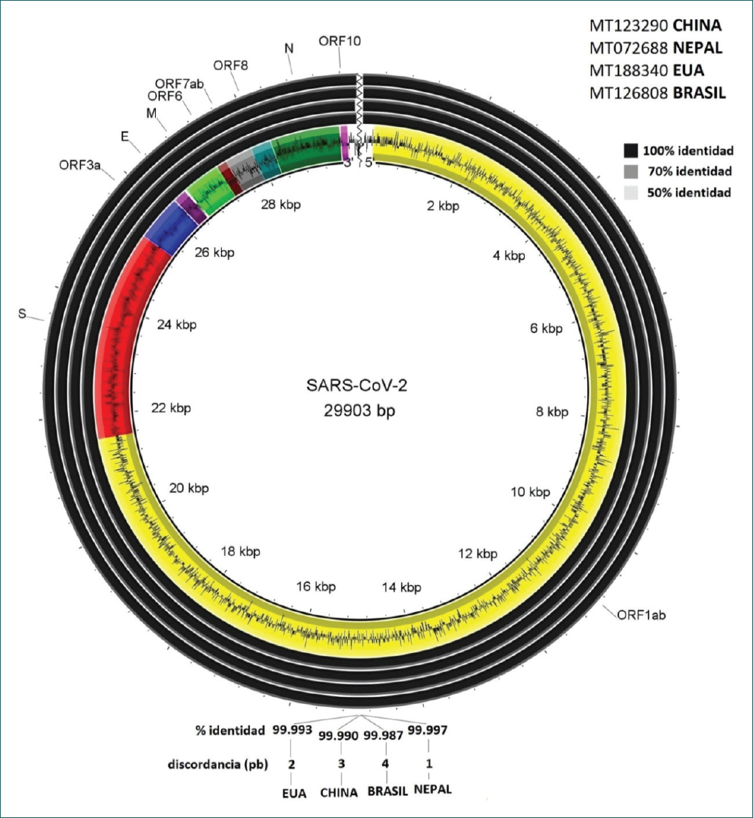 En general, la comparación de los genomas completos se hizo con la herramienta de BLAST BRIG-095. Los genomas de virus SARS-CoV-2 analizados de varias regiones del mundo presentan valores de identidad en más del 99%, virtualmente en el 100% de los casos, con no más de cuatro pares de bases de diferencia con el genoma de referencia, lo que podría indicar que el virus se ha mantenido relativamente estable en su genoma. En otras palabras, independientemente del sitio geográfico de donde provenga el genoma viral, la identidad es alta, y a este nivel, y con estas herramientas, no parece que existan variantes geográfico-específicas (Fig. 1).