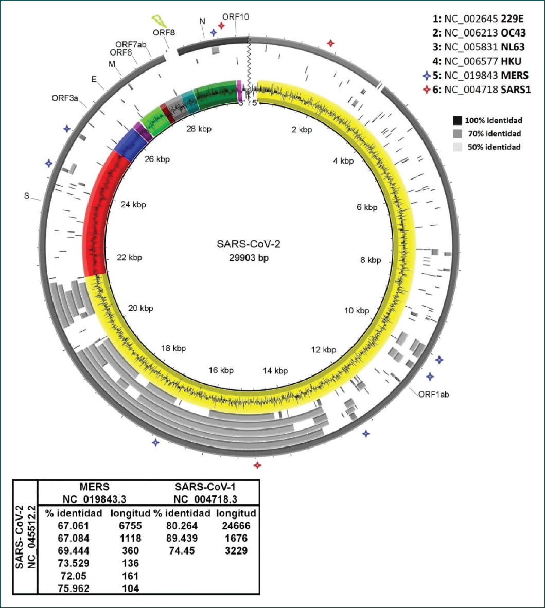 Comparación del genoma completo de SARS-CoV-2 con otros genomas de coronavirus humanos. Representación gráfica circular que favorece la visualización de las zonas de similitudes y diferencias entre los genomas estudiados. El círculo central corresponde al genoma de referencia lineal (5´- 3´) de 29 903 pb NC_045512.2 (SARS-CoV-2 Wuhan-Hu-1), que se comparó contra otros seis genomas de coronavirus humanos (círculos siguientes) (NC_006577.2 HKU1; NC_004718.3 SARS1; NC_019843.3 MERS; NC_002645.1 229E; NC_006213 OC43; NC_005831 NL63). Se agregaron etiquetas y colores específicos para cada región del virus, las cuales corresponden a: ORF1ab (amarillo), S (rojo), ORF3a (azul), E (morado), M (limón), ORF6 (guinda), ORF7ab (gris), ORF8 (celeste), N (verde), ORF10 (rosa). La identidad entre los genomas se visualiza en la intensidad del color: blanco: sin identidad; gris claro: identidades cercanas al 50%; gris: identidades cercanas al 70%; negras: identidades cercanas al 100%. Se colocó una tabla de porcentaje de identidades para los genomas de SARS-COV-1 y MERS para cada fragmento con “e-value” < 0.0001, en la que resaltaron los fragmentos anotados y se evidenció la diferencia del ORF8 entre SARS-CoV-1 y SARS-CoV-2.