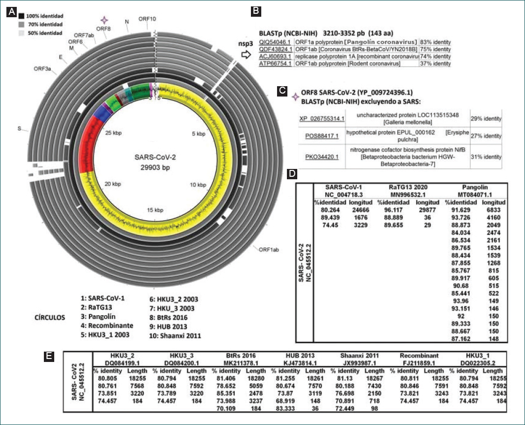 Cepas no humanas tipo SARS-CoV-2 de acuerdo con ORF8. A: gráfico circular que favorece la visualización de las zonas de similitudes y diferencias entre los genomas estudiados. El círculo central corresponde al genoma (29 903 pb) lineal (5´- 3´) de referencia NC_045512.2 (SARS-CoV-2 Wuhan-Hu-1), el cual se comparó con otros 10 genomas de virus tipo SARS (círculos siguientes): siete aislados de murciélagos (MN996532.1 RaTG13, DQ022305.2 HKU3-1, DQ084199.1 HKU3-2, DQ084200.1 HKU3-3, MK211378.1 BtRs 2016, KJ473814.1 HuB 2013 y JX993987.1 Shaanxi 2011), uno recombinante de laboratorio consenso de murciélago (FJ211859.1), un aislado de pangolín (MT084071.1) y SARS-CoV-1 (NC_004718.3). Se agregaron etiquetas y colores específicos para cada región del virus, señaladas con etiquetas, las cuales corresponden a: ORF1ab (amarillo), S (rojo), ORF3a (azul), E (morado), M (limón), ORF6 (guinda), ORF7ab (gris), ORF8 (celeste), N (verde), ORF10 (rosa). La identidad entre los genomas se visualiza en la intensidad del color: blanco: sin identidad; gris claro: identidades cercanas al 50%; gris: identidades cercanas al 70%; negras: identidades cercanas al 100% (con el genoma completo de coronavirus del pangolín guarda varios fragmentos de alta identidad, pero dispersos en todo el genoma). Son observables las diferencias en varias regiones de la espiga (S). B: se muestran las diferencias con los genomas de murciélagos en ORF1ab (nsp3) región 3210-3352, seguido de una tabla de similitud en aminoácidos con otros coronavirus derivada de un análisis de blastp. C: se muestra también la diferencia del ORF8 únicamente con SARS-CoV-1, seguida de la tabla de similitud al realizar un blastp de la secuencia de aminoácidos YP_009724396.1, correspondiente a ORF8 de SARS-CoV-2, análisis realizado excluyendo virus tipo SARS. D-E): finalmente se colocaron tablas de porcentaje de identidades de todos los genomas para cada fragmento con “e-value” < 0.0001.