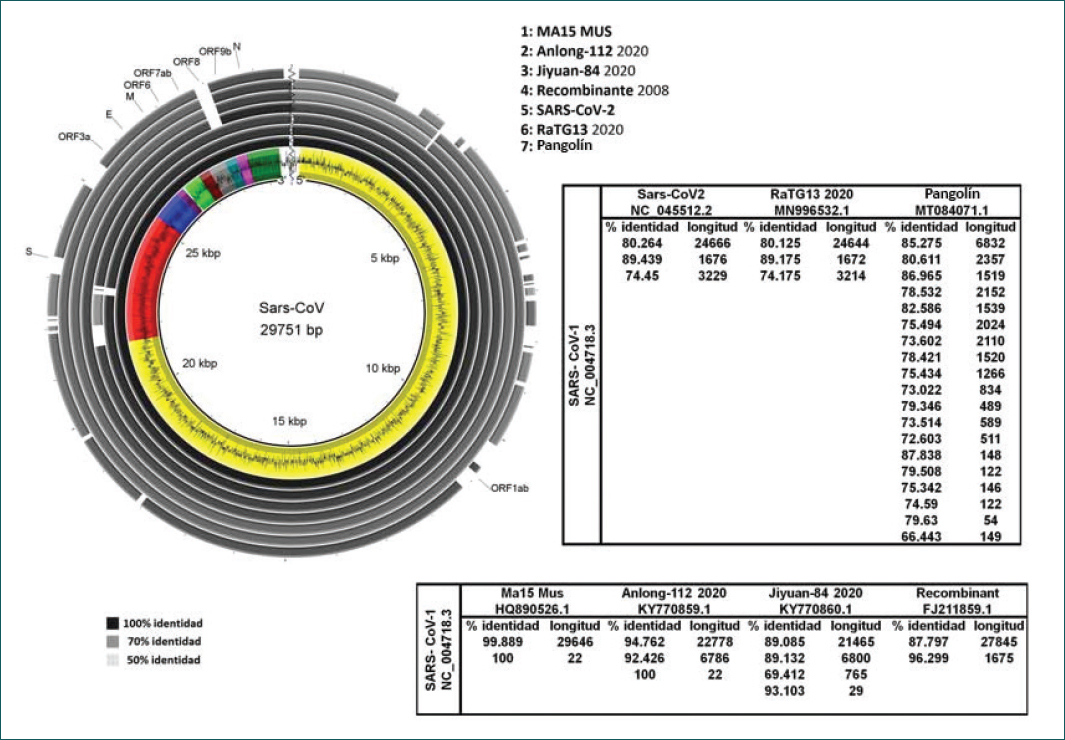 Cepas no humanas tipo SARS-CoV-1 de acuerdo con ORF8. El círculo central corresponde al genoma de referencia NC_004718.3 de SARS-CoV-1, el cual se comparó con otros siete genomas de virus tipo SARS (círculos siguientes): tres aislados de murciélagos (KY770859.1 Anlong-112, KY770860.1 Jiyuan-84 y MN996532.1 RaTG13), uno aislado de pangolín (MT084071.1), el SARS recombinante (FJ211859.1), el SARS adecuado a ratón (HQ890526.1 MA15) y SARS-CoV-2 (NC_045512.2). Se agregaron etiquetas y colores específicos para cada región del virus, señaladas con etiquetas, que corresponden a: ORF1ab (amarillo), S (rojo), ORF3a (azul), E (morado), M (limón), ORF6 (guinda), ORF7ab (gris), ORF8 (celeste), N (verde) y ORF10 (rosa). La identidad entre los genomas se visualiza en la intensidad del color: blanco: sin identidad; gris claro: identidades cercanas al 50%; gris: identidades cercanas al 70% y negras: identidades cercanas al 100%. Se colocó una tabla de porcentaje de identidades de todos los genomas para cada fragmento con “e-value” < 0.0001, lo cual evidenció la disminución del porcentaje de identidad con RaTG y pangolín, y las zonas de no concordancia con ORF8, ORF1ab (nsp3) y S, con SARS-COV-2 y virus similares a este de murciélago, como RaTG, la recombinante y la de pangolín.