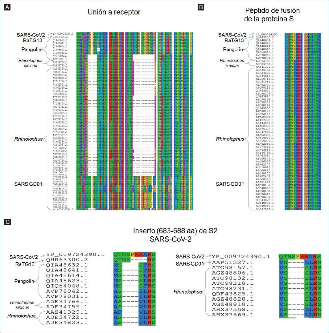 Comparación de la secuencia de aminoácidos de la espícula (S) de SARS-CoV-2 con cepas tipo SARS. A: alineamiento de la secuencia de unión a receptor de la proteína S o espiga. B: alineamiento de la secuencia del péptido de fusión de la proteína S. C: alineamiento de la secuencia de un inserto de la proteína S. La primera secuencia, YP_009724390.1, corresponde al SARS-CoV-2, mientras que la segunda secuencia, QHR63300.2, corresponde a RaTG13, perteneciente a coronavirus de Rhinolophus affinis; las secuencias 3-7 corresponden a pangolín; las secuencias 8 y 9 corresponden al coronavirus de murciélago Rhinolophus sinicus; las siguientes secuencias corresponden a coronavirus aislados de murciélagos del género Rhinolophus y también se incluye la secuencia AAP51227.1, correspondiente a SARS GD01.