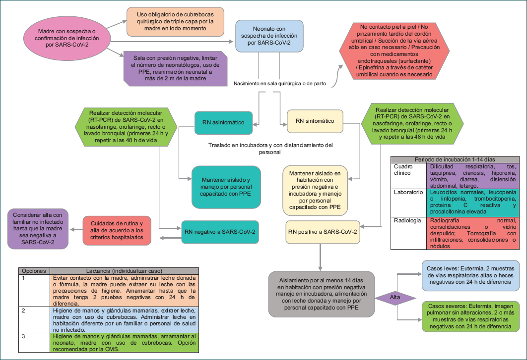 En la figura 1 se muestra un flujograma que resume los diferentes procesos para el manejo de los recién nacidos con sospecha o infección confirmada por SARS-CoV-2.