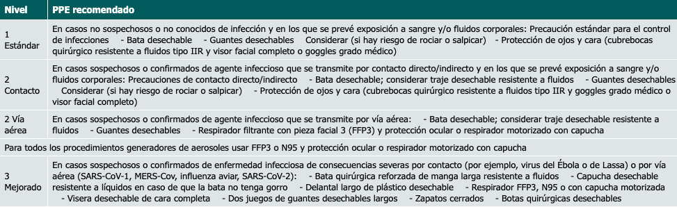 45. Health Protection Scotland. Appendix 16-Best Practice-Aide memoire for levels of Personal Protective Equipment (PPE) for healthcare workers when providing patient care. Scotland, United Kingdom: Health Protection Scotland;2019. Disponible en: http://www.nipcm.hps.scot.nhs.uk/media/1437/2019-02-11-aide-memoire-for-levels-of-personal-protective-equipment-ppe-for-healthcare-workers-for-patient-care.pdf.